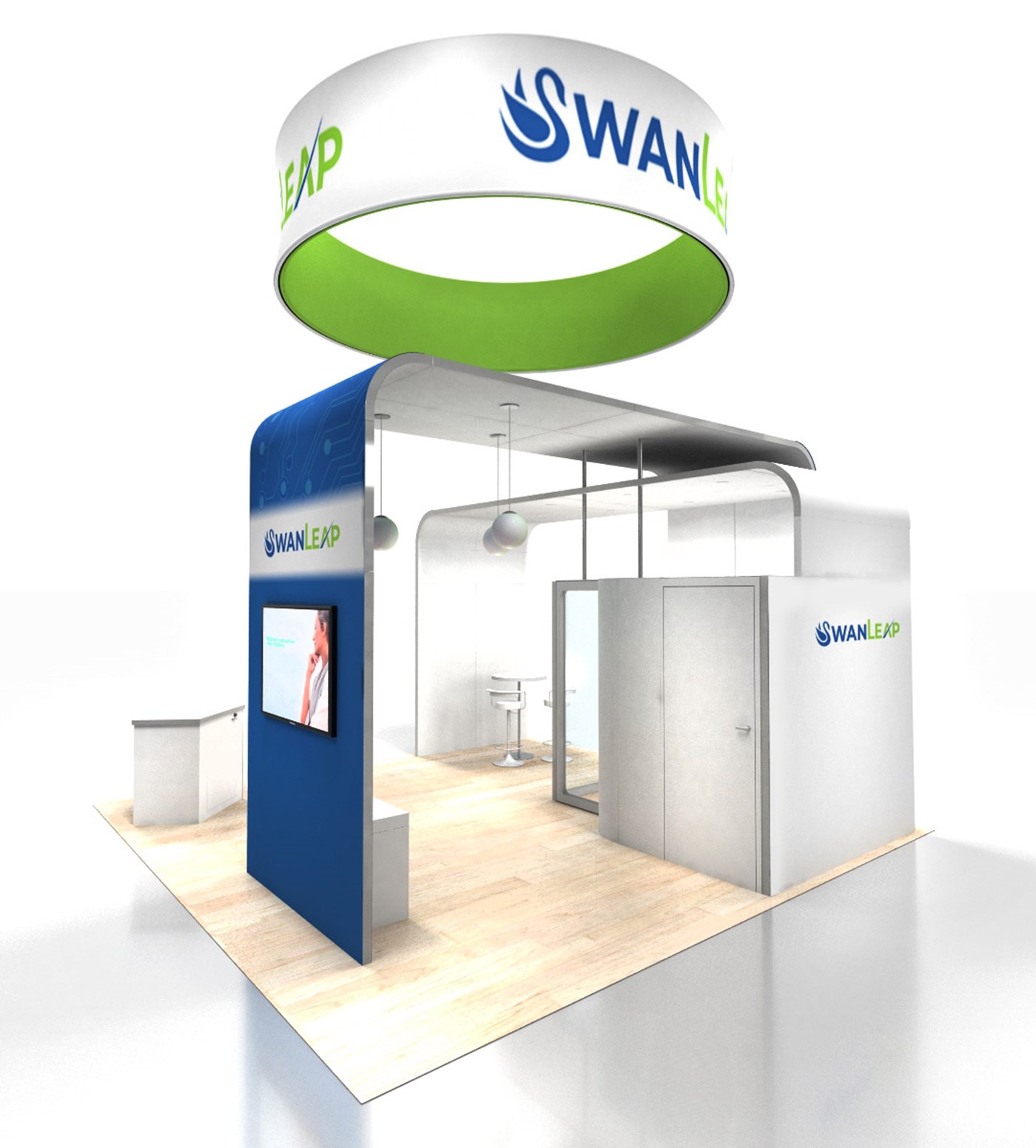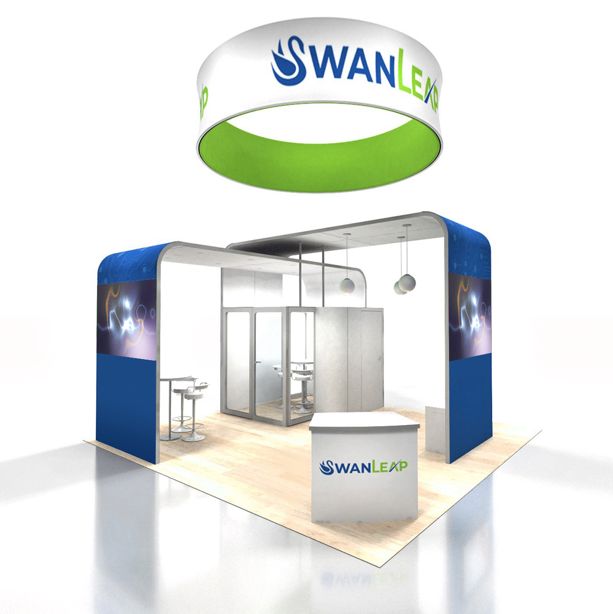10' and 11' Tall ceiling canopies with white pendent lighting, (4) perimeter dye-sublimation tension fabric graphics. 8' x 10' Conference room with frosted acrylic panels and locking storage closet. Ceiling panels, closet and inside white or black panels.