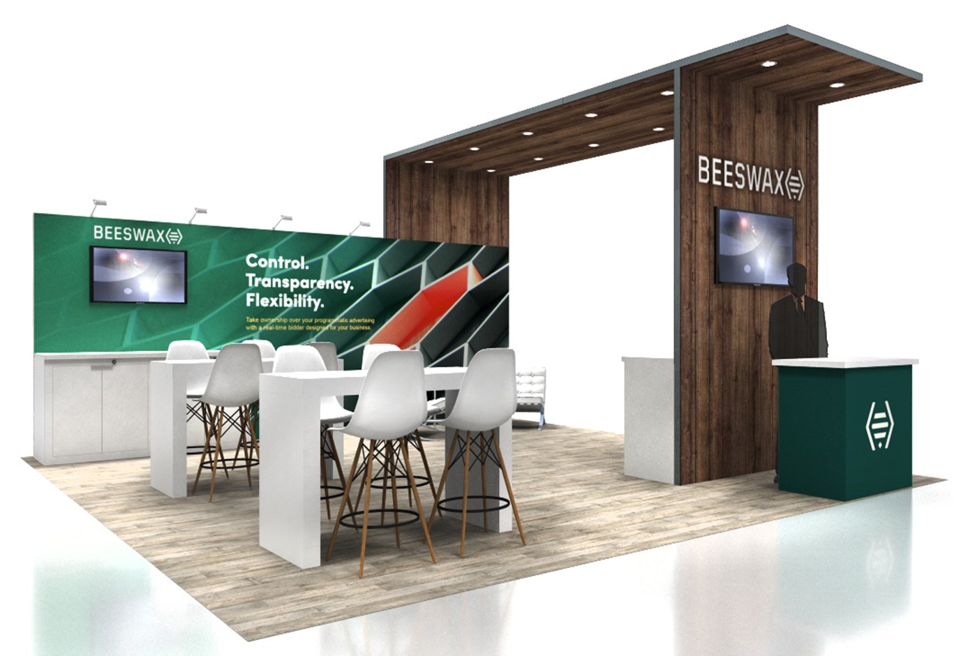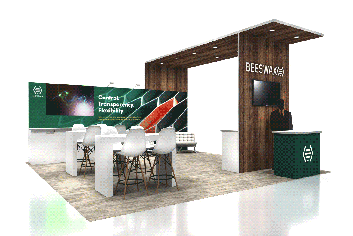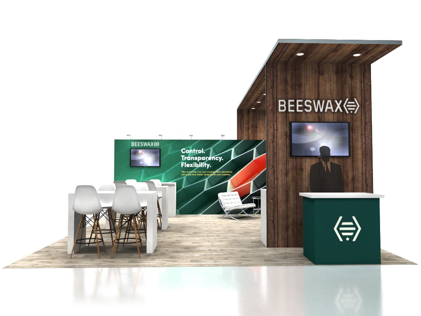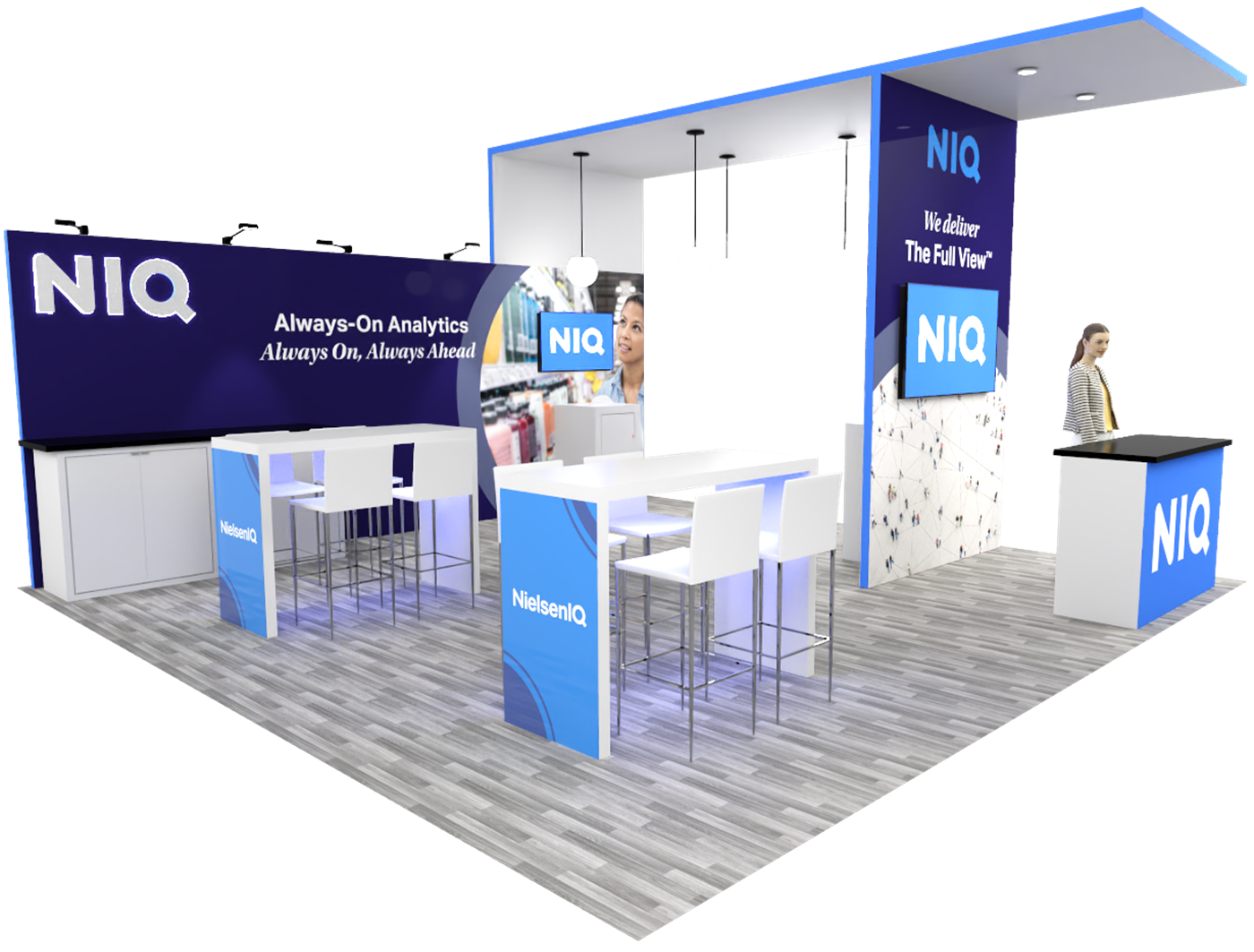 8' Tall backwall with front & back 20' wide tension fabric SEG graphics, front-facing vertical wall with (2) 12' tall double-sided graphics on front-facing vertical wall, (2) double-sided black or white finish on upper rear facing vertical wall, canopy in white or black. Integrated LED down-lighting and stem lighting.