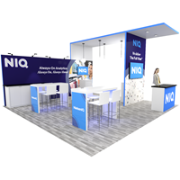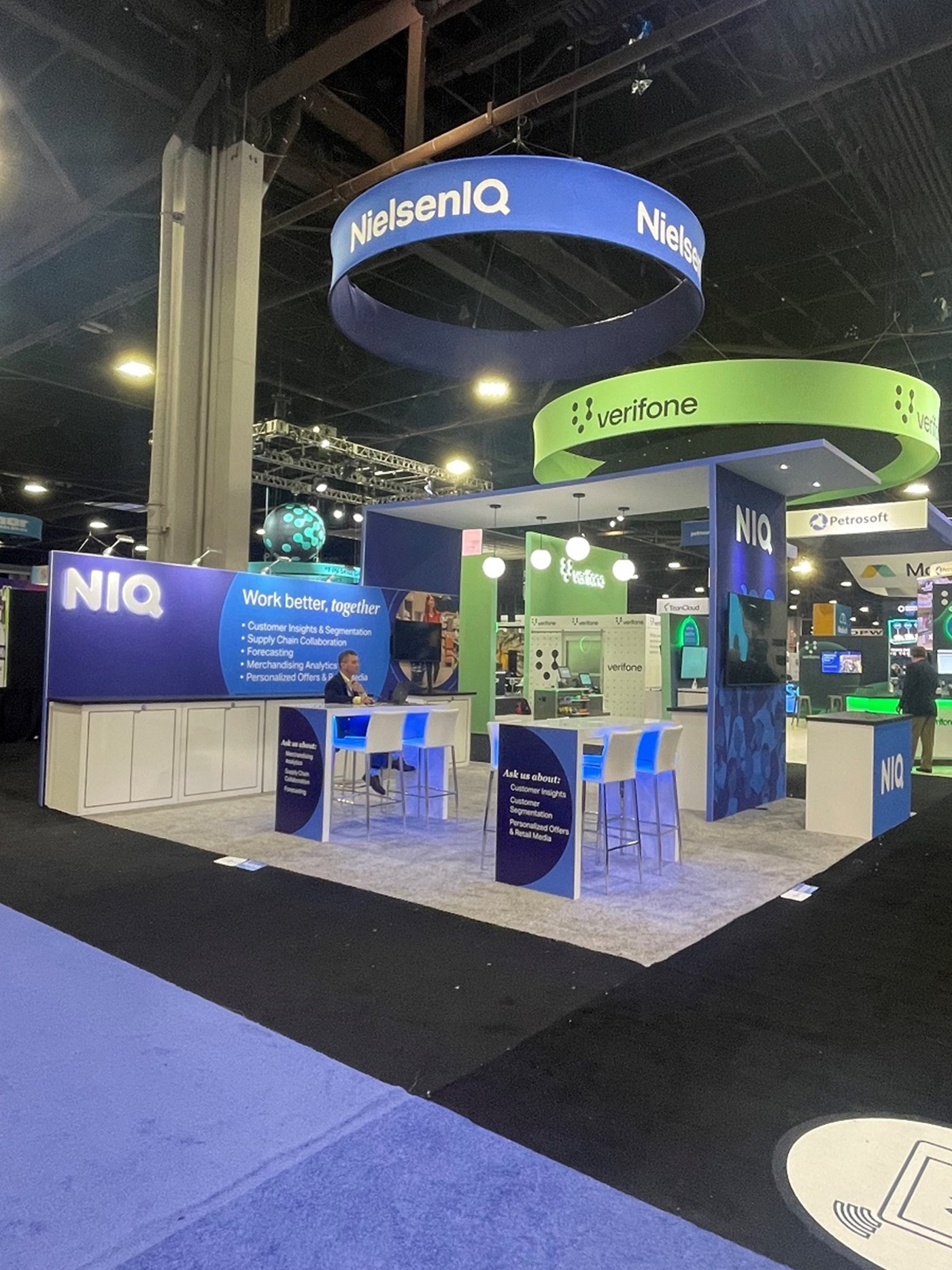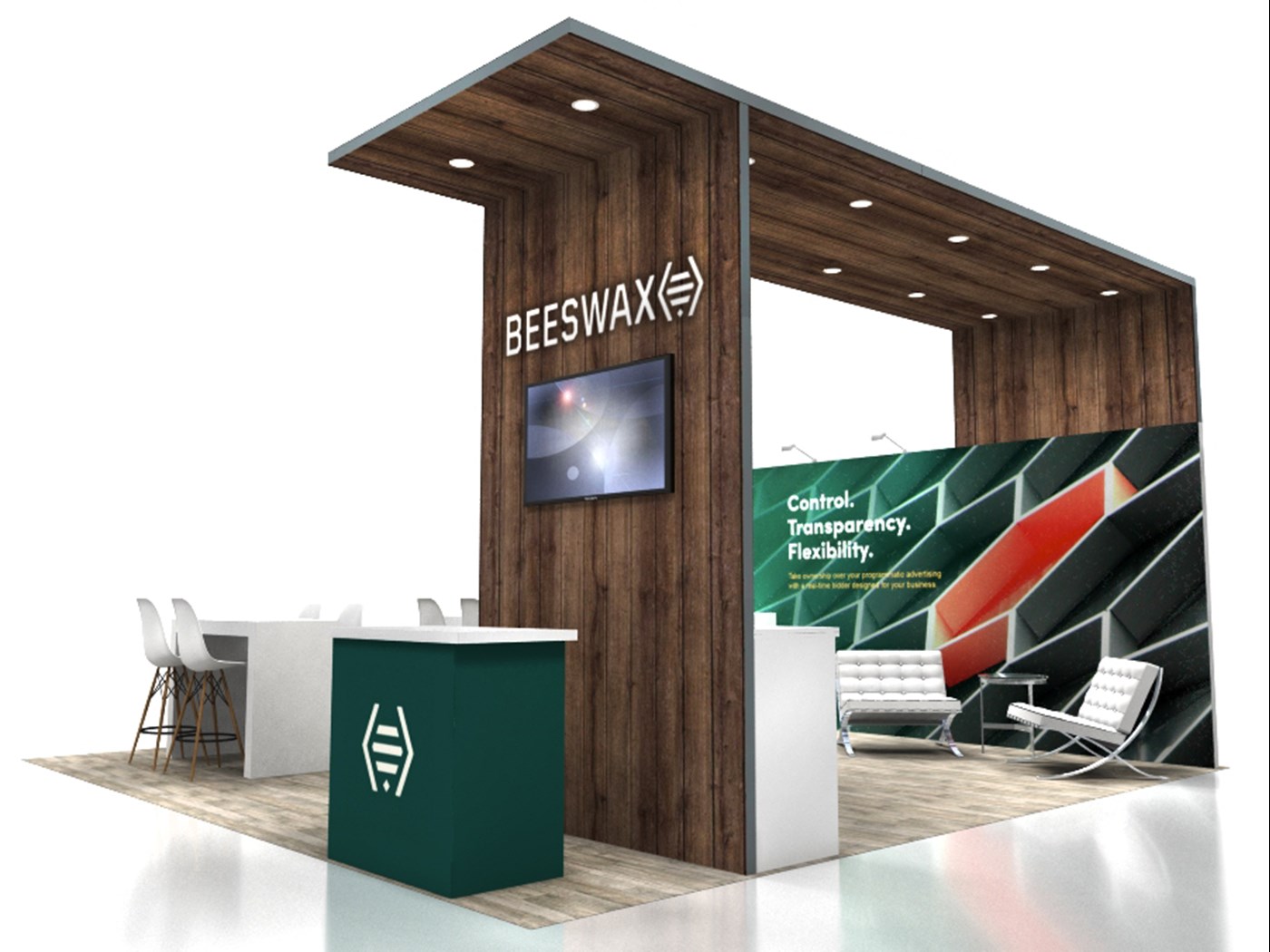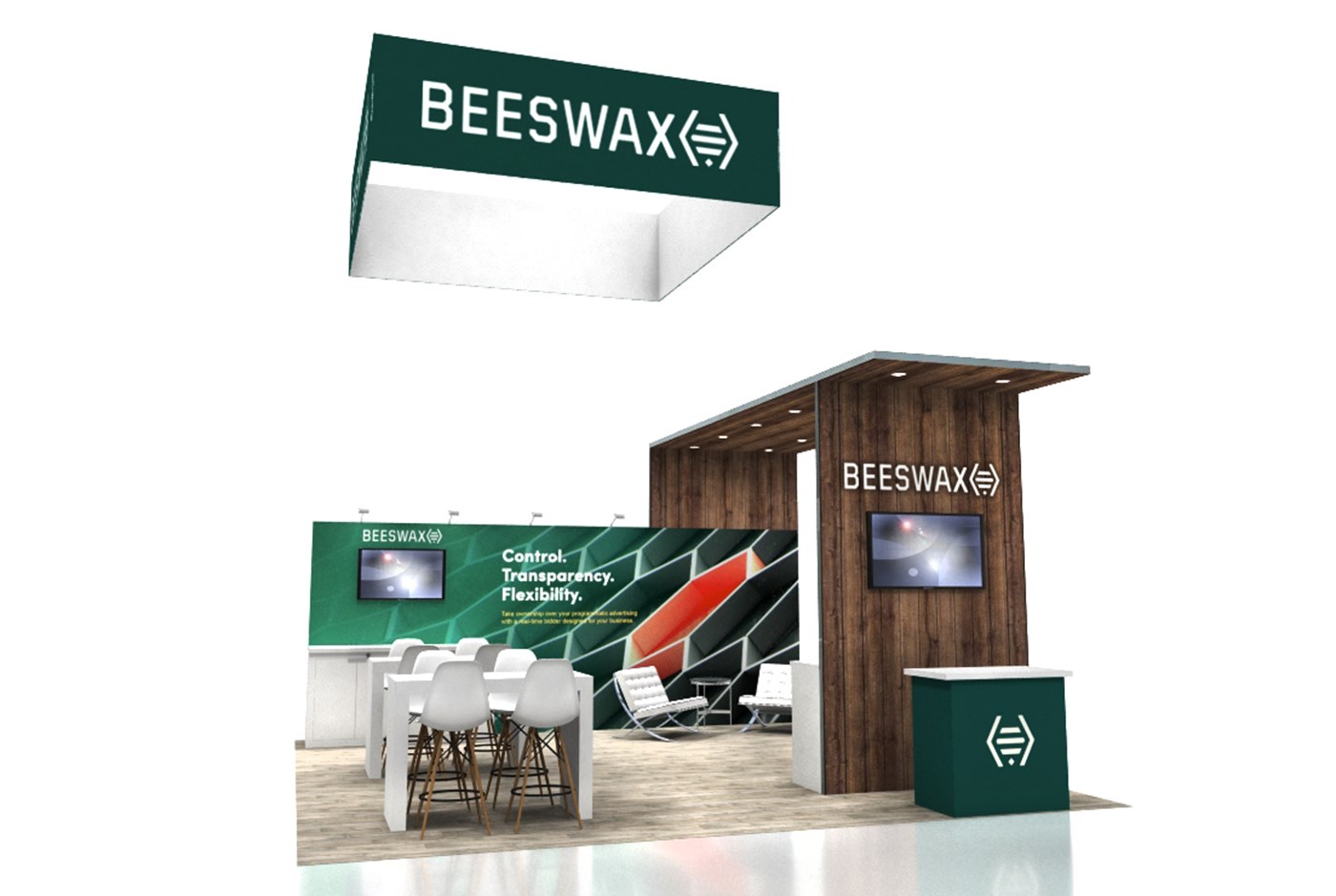 8' Tall backwall with front & back 20' wide tension fabric SEG graphics, front-facing vertical wall with (2) 12' tall double-sided graphics on front-facing vertical wall, (2) double-sided black or white finish on upper rear facing vertical wall, canopy in white or black. Integrated LED down-lighting and stem lighting.
