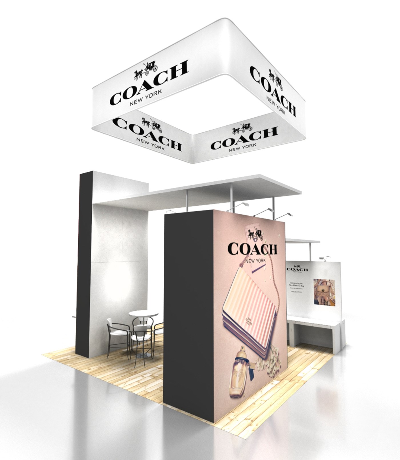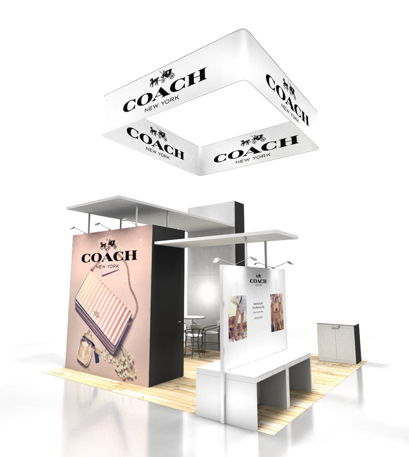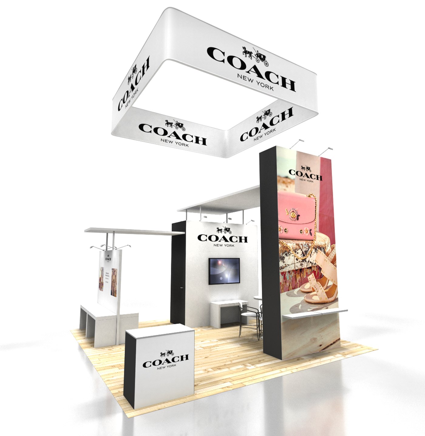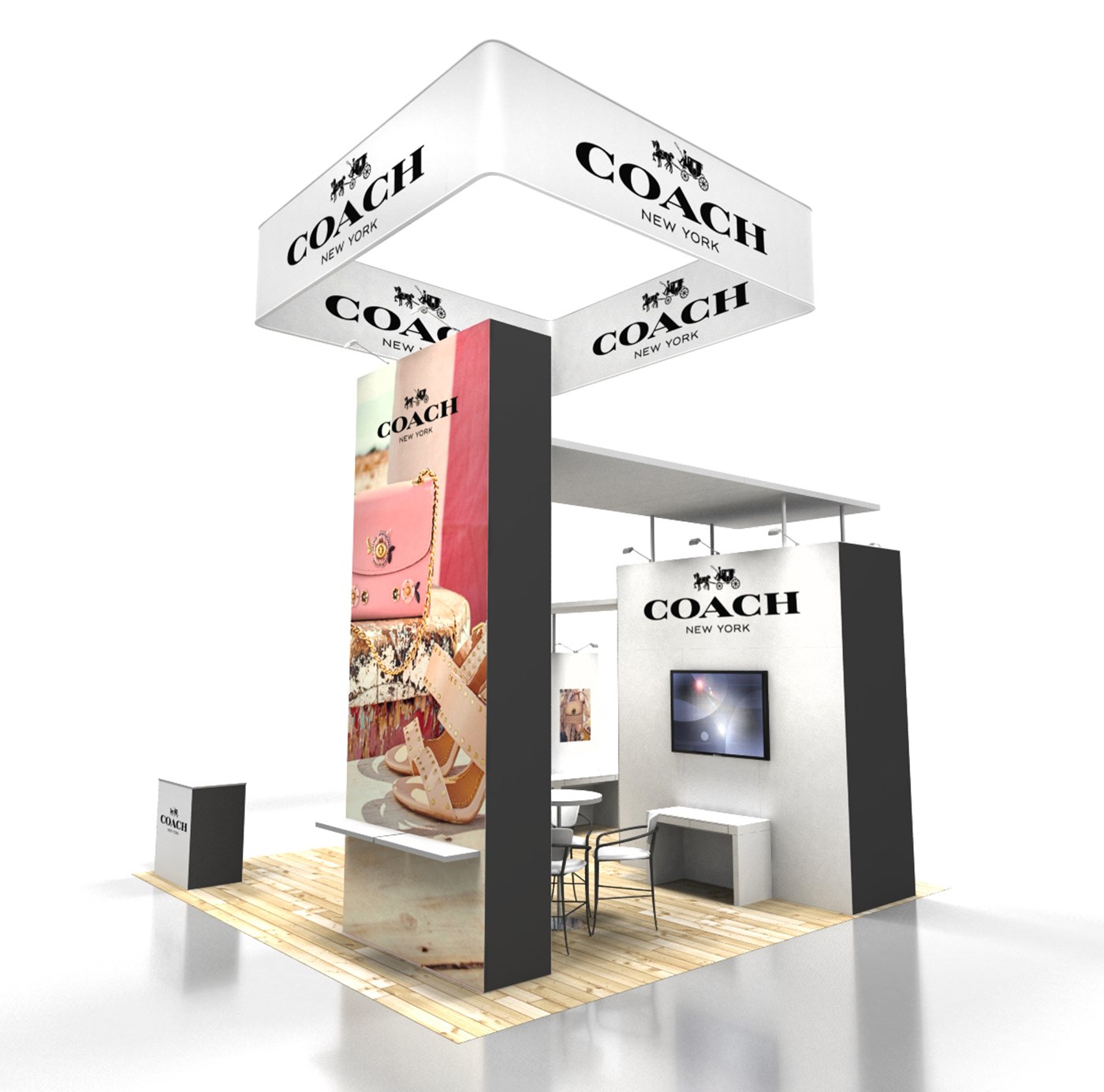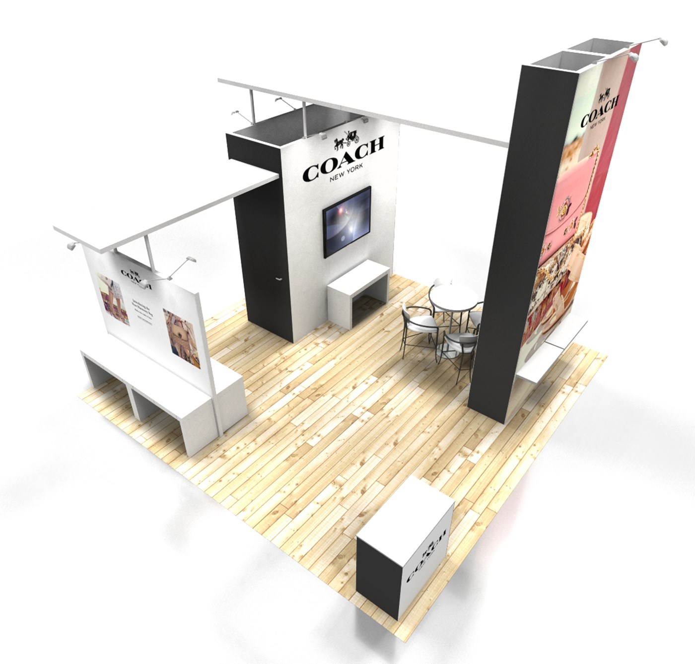 16' Tall tower with outside graphic & black or white inside & sides, 12' tall locking storage tower with 4-tier free standing shelving, double-sided graphics & black or white side accents and 8' perimeter wall with double-sided graphics. 2 Ceiling canopies in white or black accents. LED stem lighting.