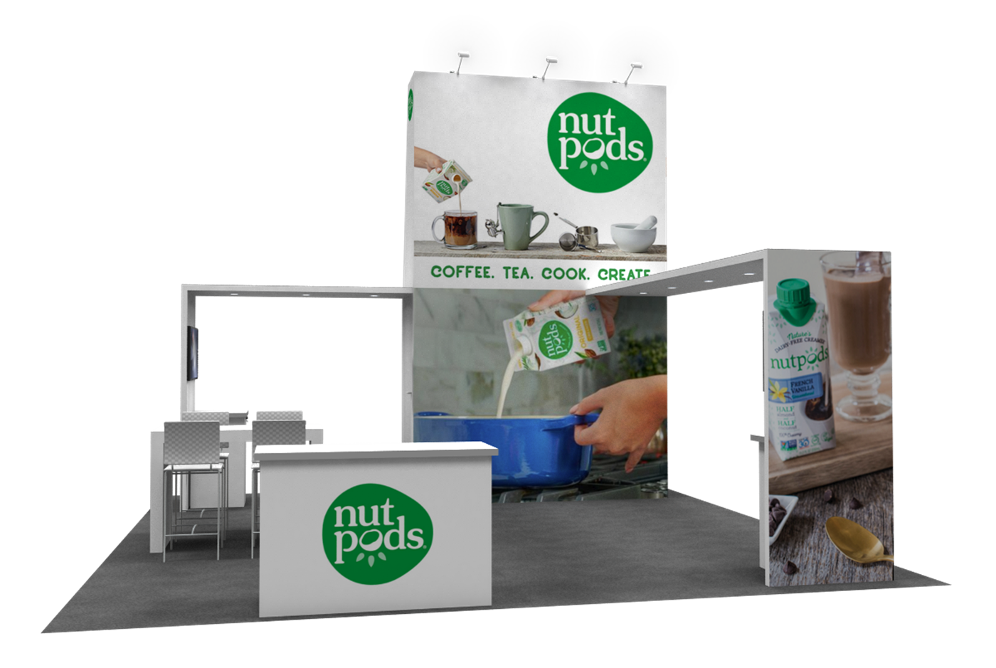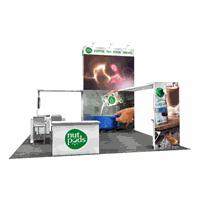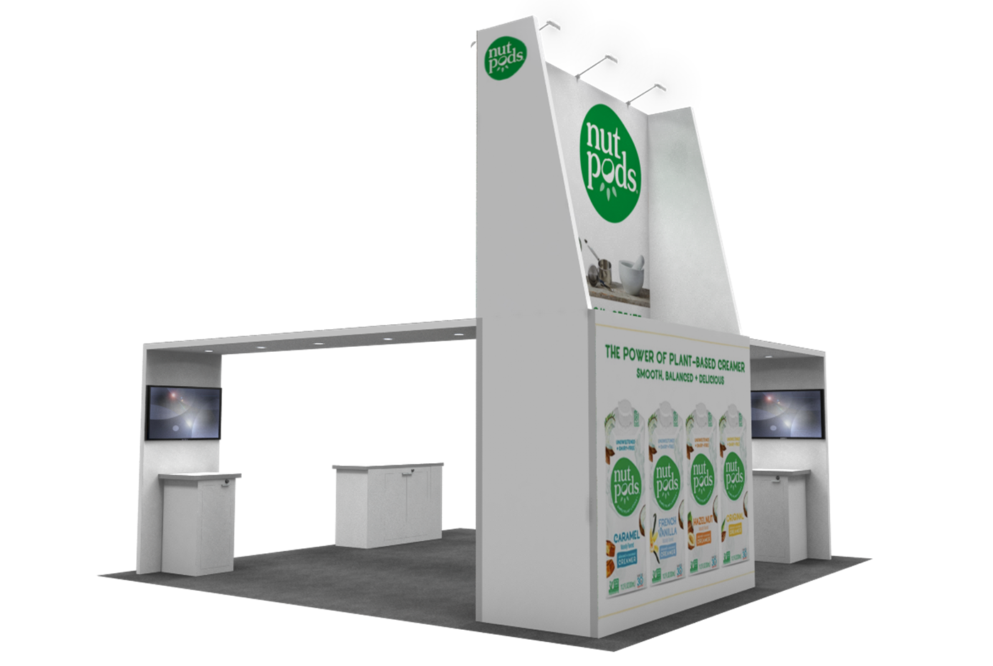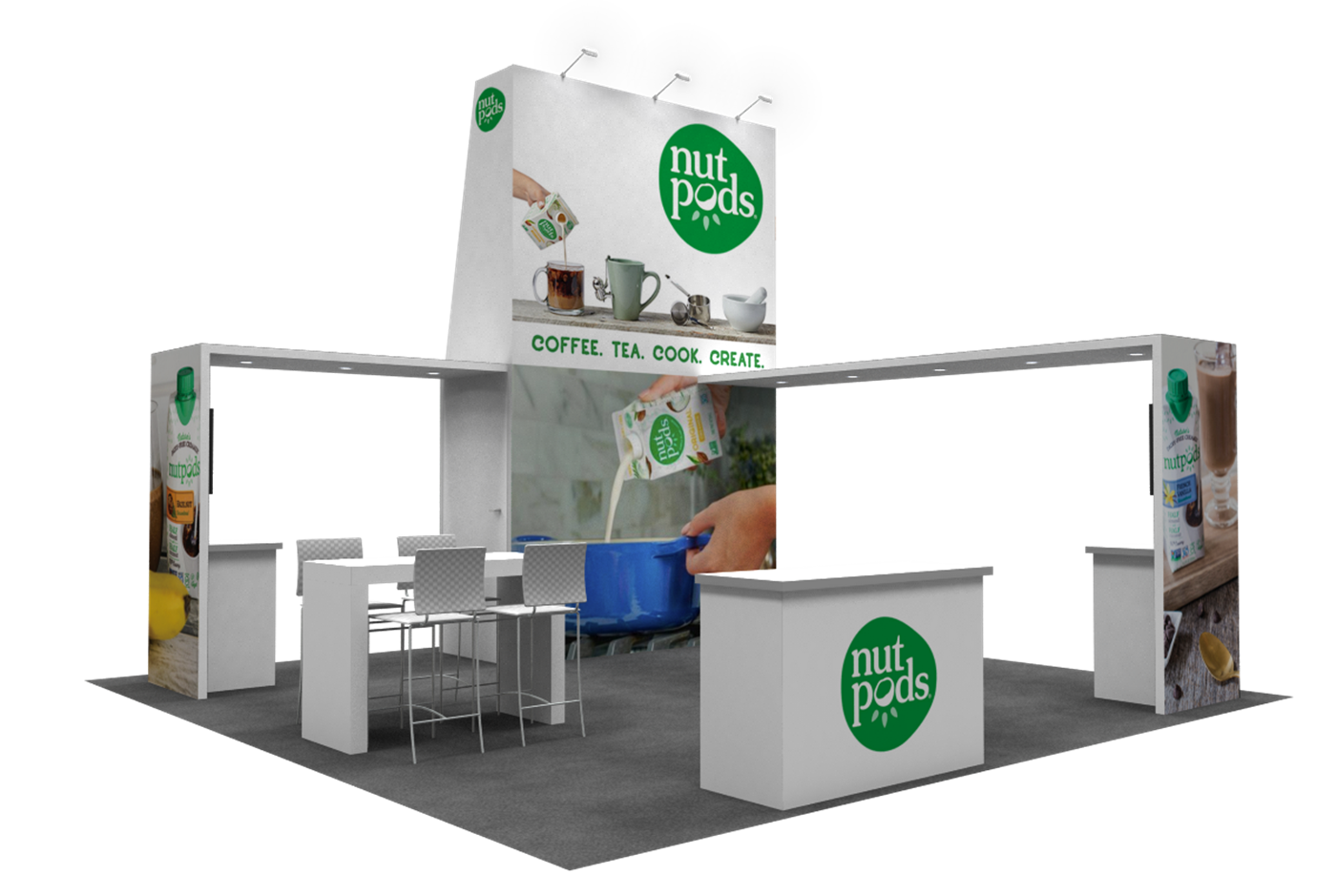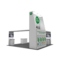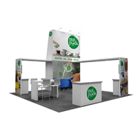 20' x 20' Rental exhibit designed for modern custom appeal with pre-assembled FOUNDATION aluminum framing and tool-less connections. Dye sublimation tension fabric SEG graphics printed in-house for excellent edge-to-edge taut finish.