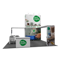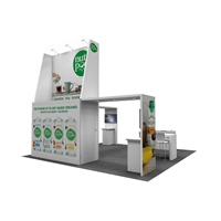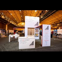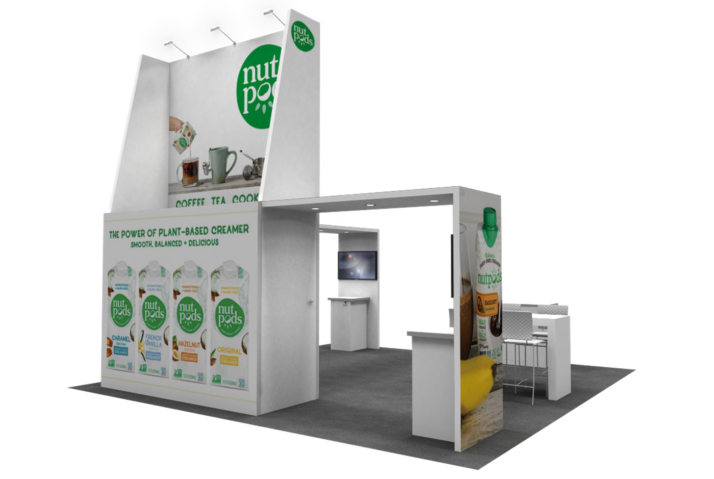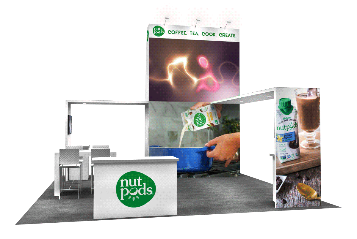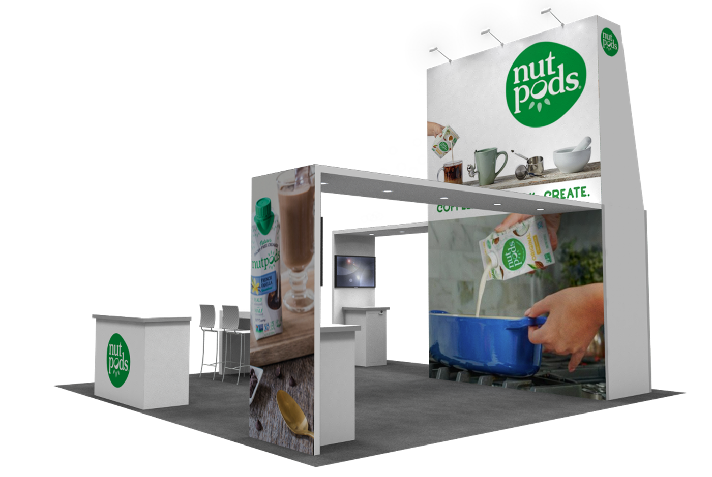 20' x 20' Rental exhibit designed for modern custom appeal with pre-assembled FOUNDATION aluminum framing and tool-less connections. Dye sublimation tension fabric SEG graphics printed in-house for excellent edge-to-edge taut finish.