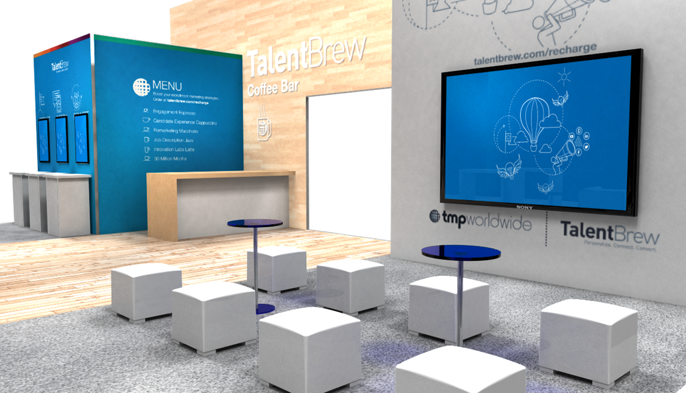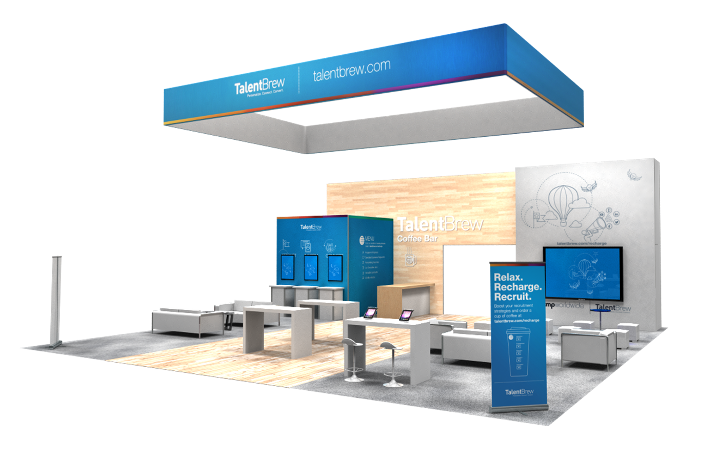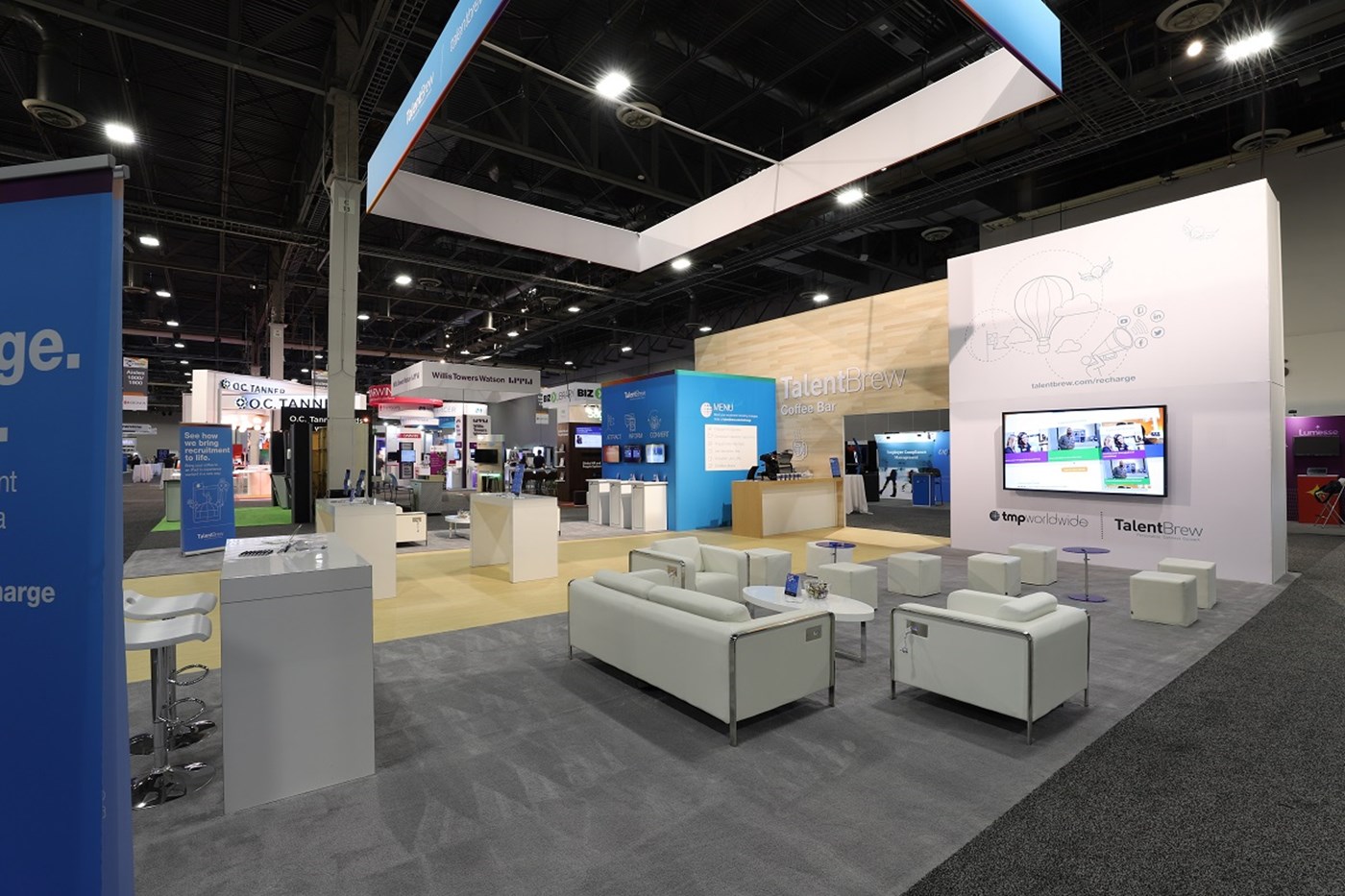 Modern rental exhibit with fresh branding appeal, inviting lounge seating and interactive tech areas.
