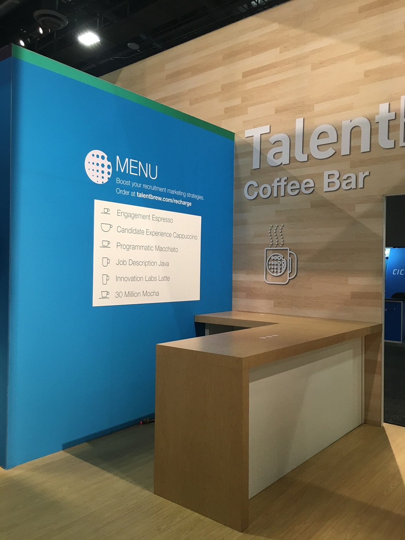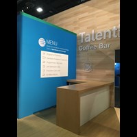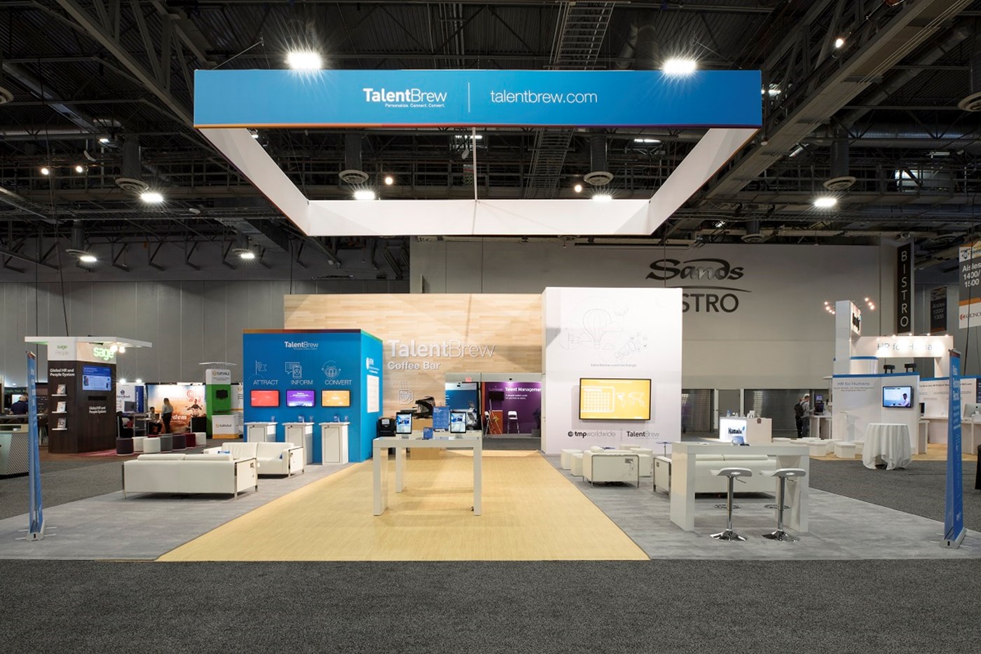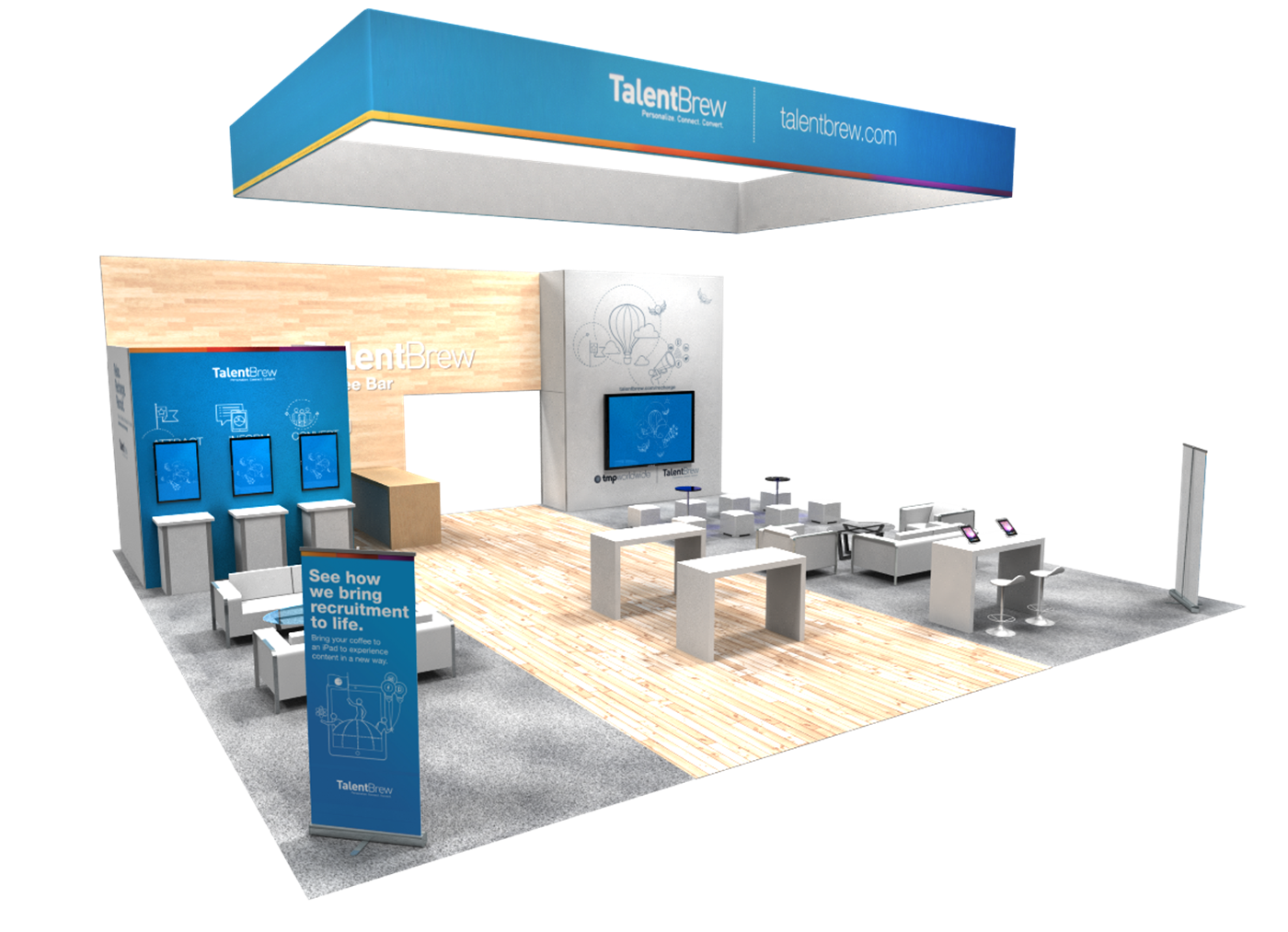 Modern rental exhibit with fresh branding appeal, inviting lounge seating and interactive tech areas.