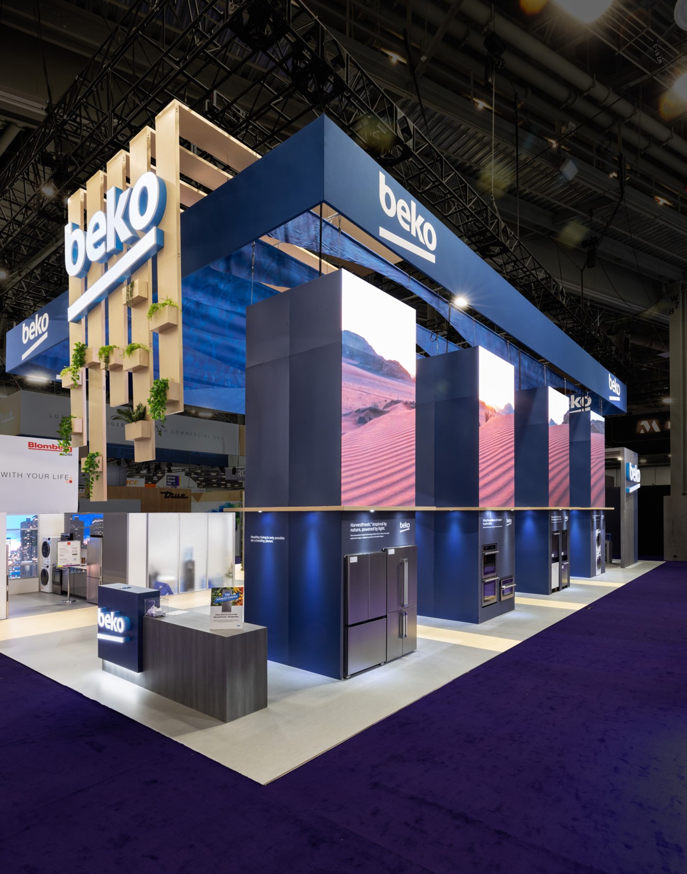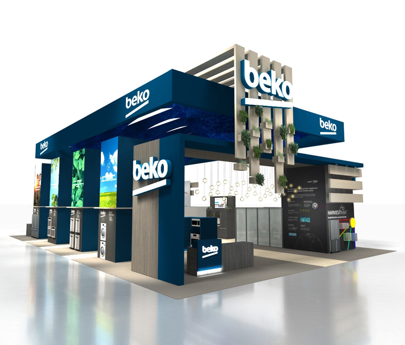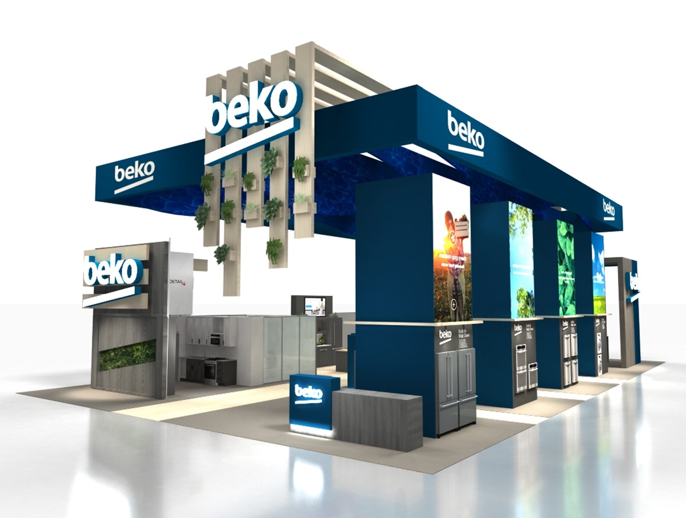Perimeter hanging sign defining flowing signature space, laminated wood plant accents with organic floral and 360 branding. (4) 20' Tall double-sided LED video towers with Sync media content, canopies, integrated appliances and branded graphics. (2) Private conference rooms with frosted acrylic panels, (2) custom kitchen vignettes and multiple (3) LED video walls on perimeters and vignette.