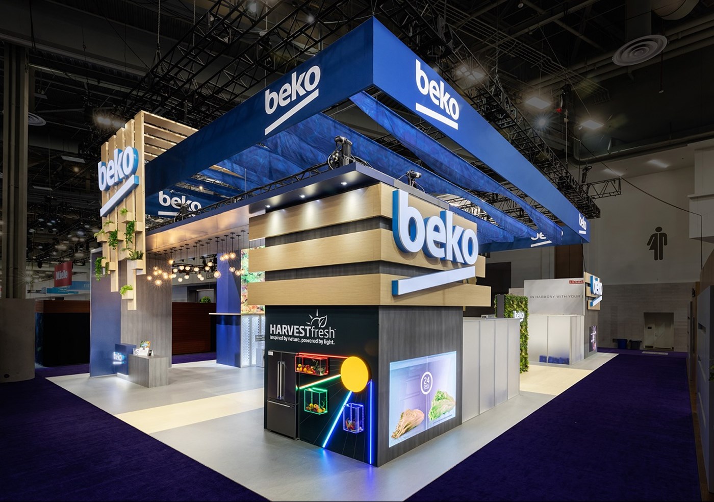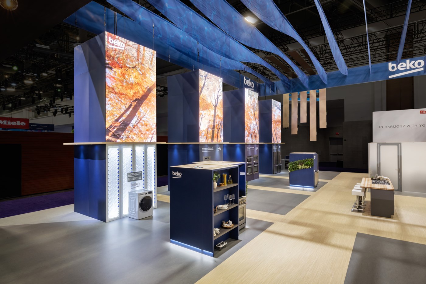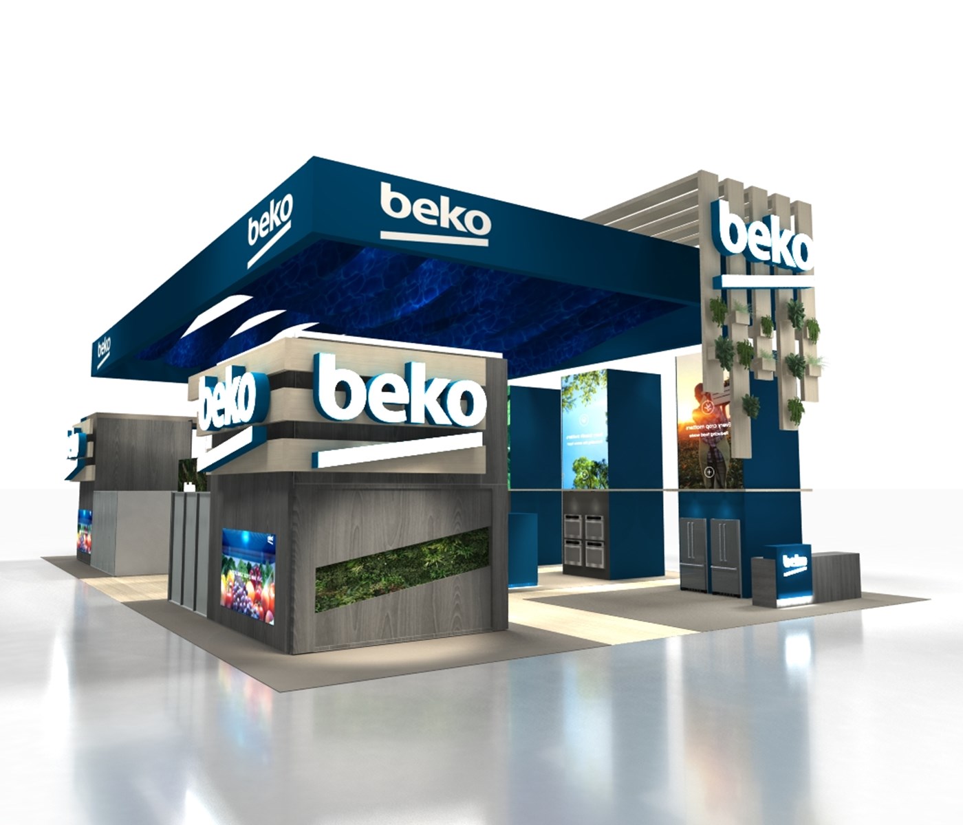 Perimeter hanging sign defining flowing signature space, laminated wood plant accents with organic floral and 360 branding. (4) 20' Tall double-sided LED video towers with Sync media content, canopies, integrated appliances and branded graphics. (2) Private conference rooms with frosted acrylic panels, (2) custom kitchen vignettes and multiple (3) LED video walls on perimeters and vignette.