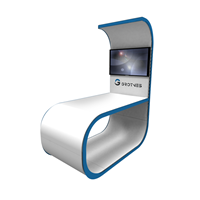 Sleek and contemporary branded kiosk with open oval counter and functional accessory options.