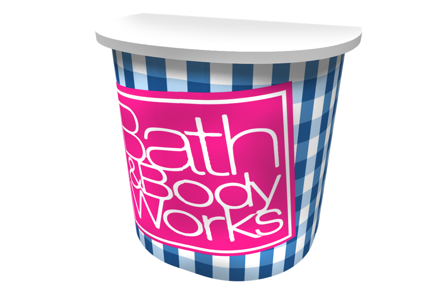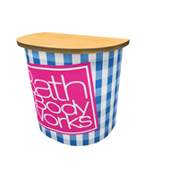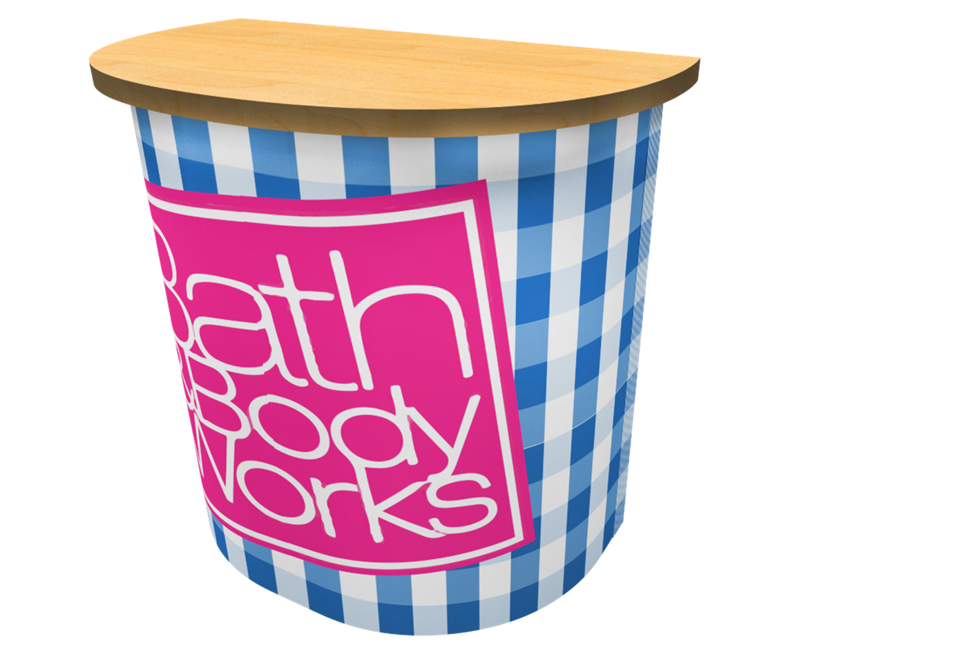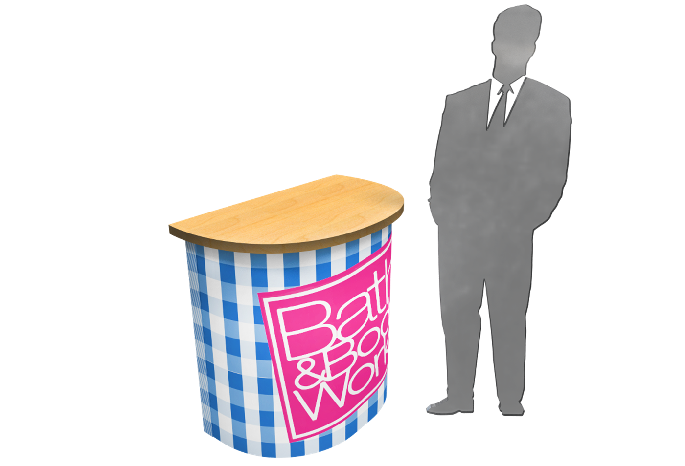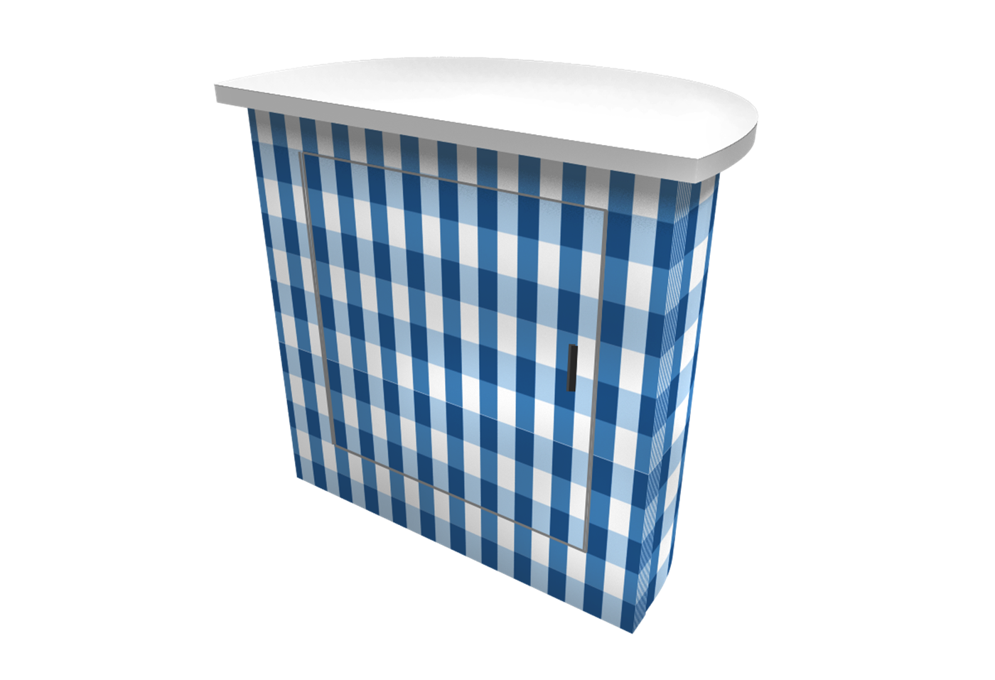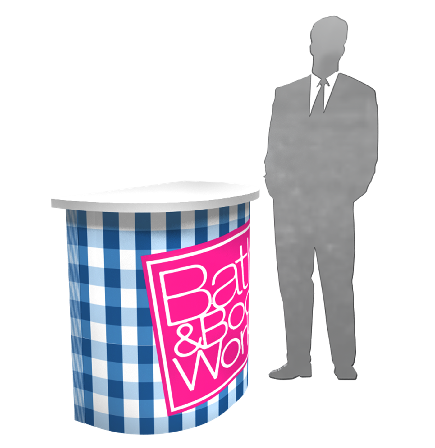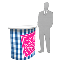 Rental curved counter with branded graphic, secure locking storage, access door and various panel finishes.