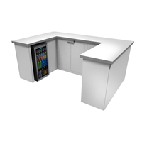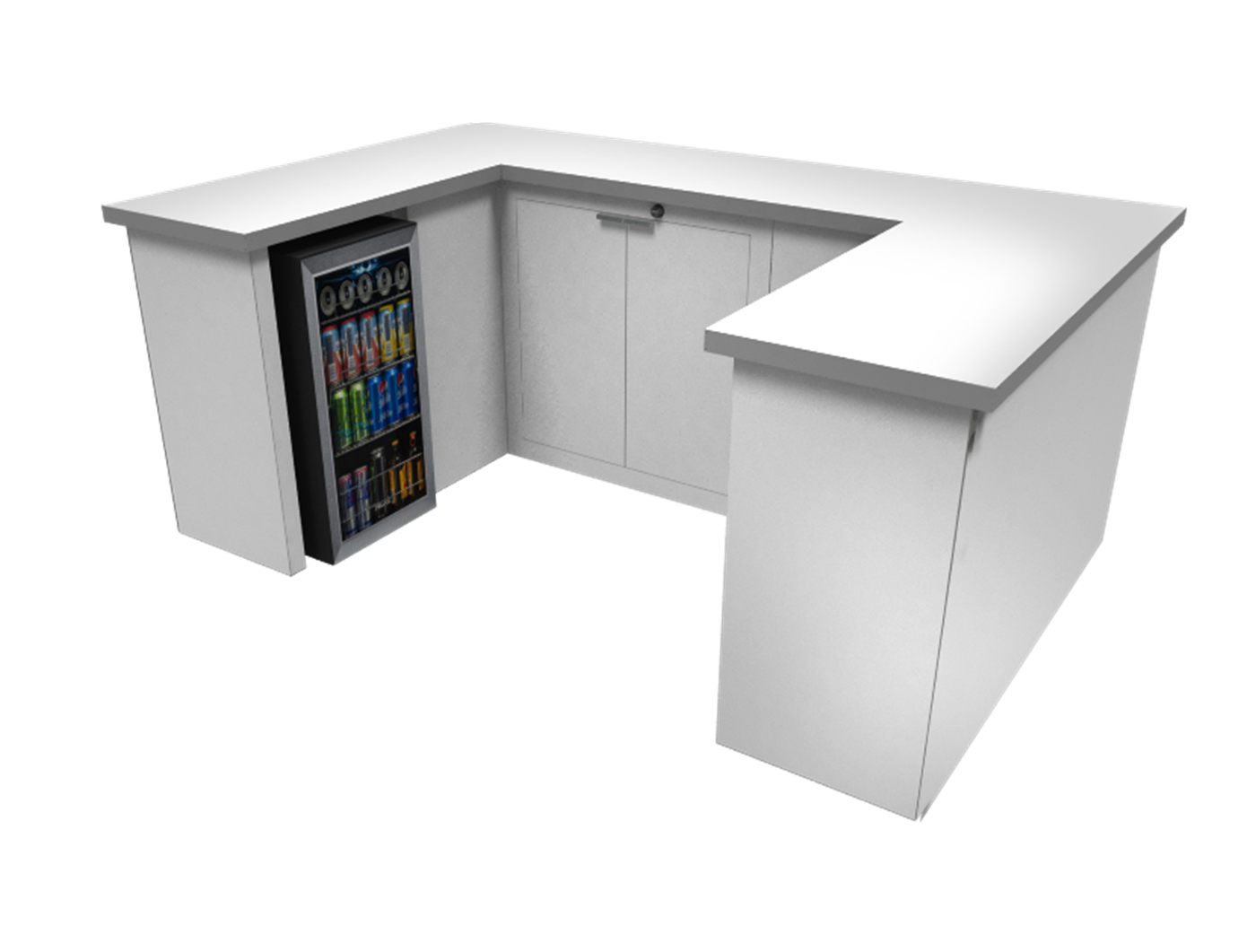 Alcove for compact refrigerator (4 cu. ft), (2) key-less locking cabinet sections with shelving, sturdy wood surface in black or white laminate with matching edging and wire-management.