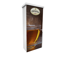 Elegant kiosk rental with branded graphics, angled ceiling cove, counter and accessory options.