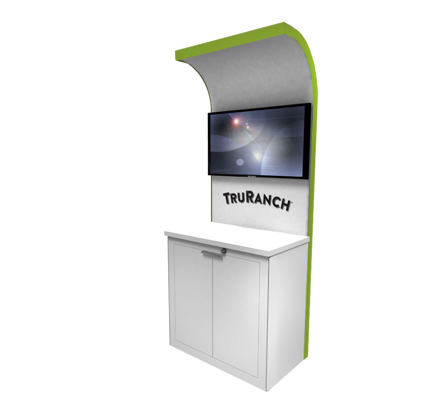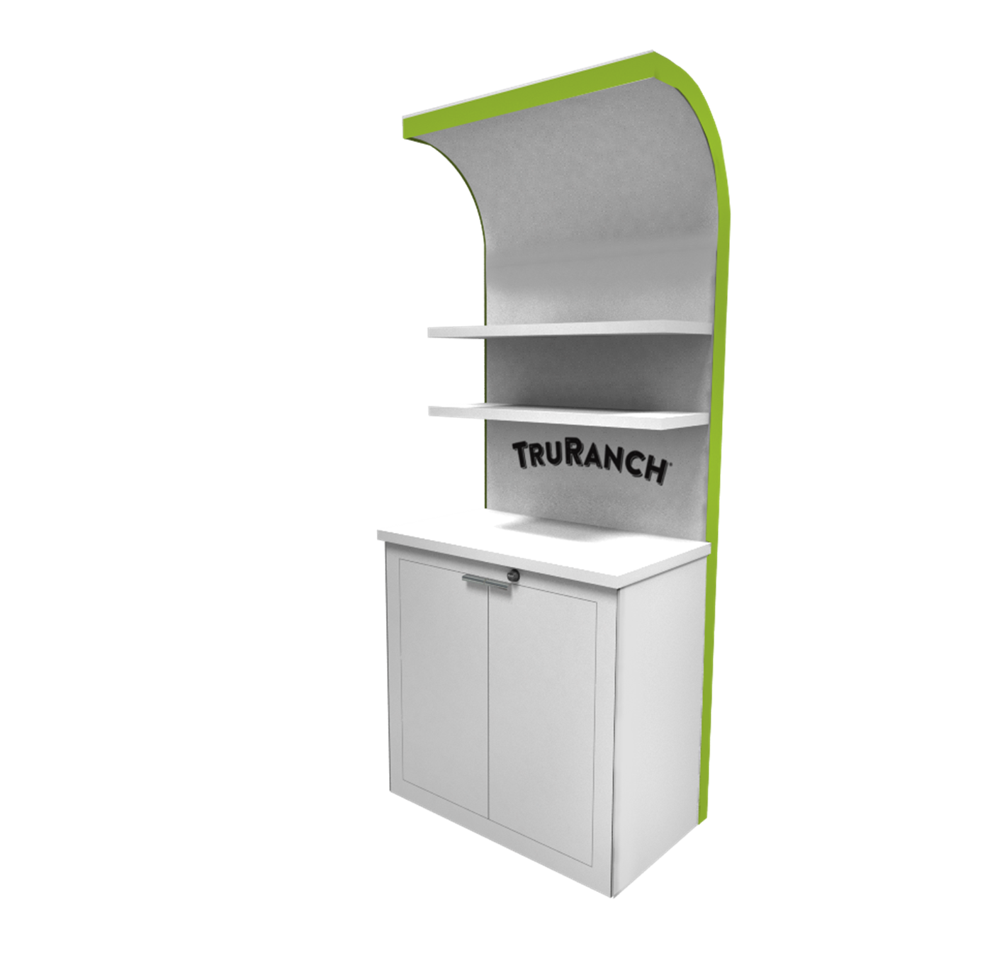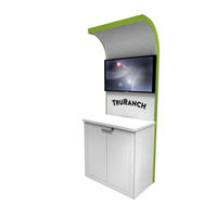 39" x 24" Key-less locking rectangular cabinet with shelving, sturdy wood surface in white or black laminate with matching edging and wire-management. Kiosk back-wall with curved ceiling accent.