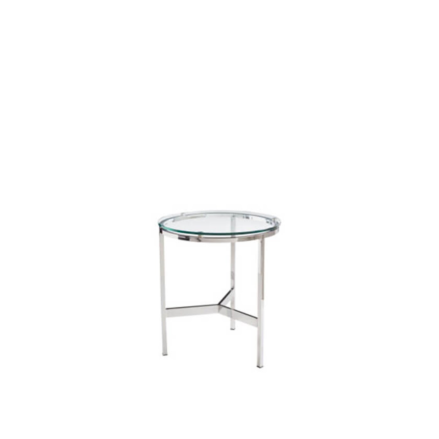 20" Rental Fuji end table with round glass top and chrome accents.