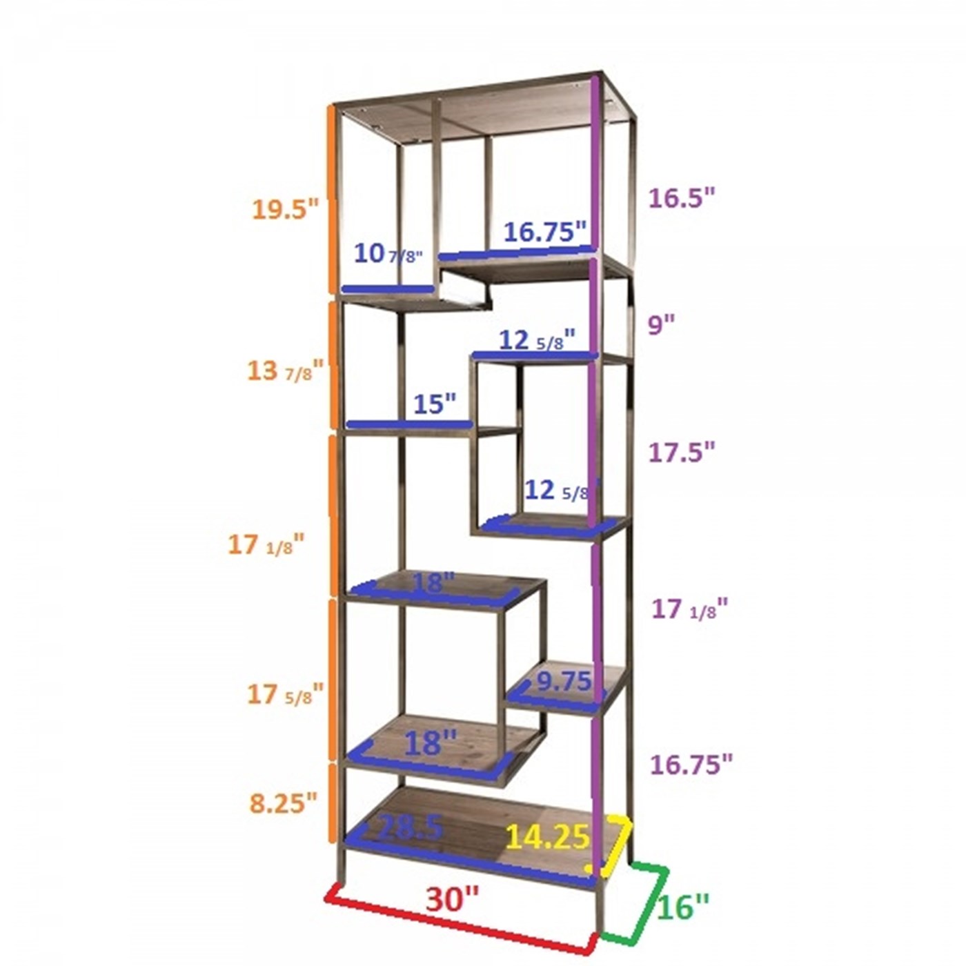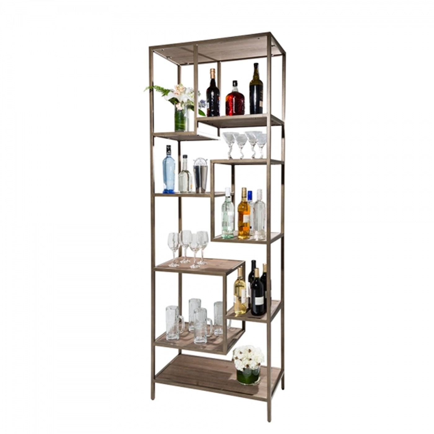 RACGEOSHF-CRT 85" Geometric Shelving $400 Stylish bronze metal and wood Geometric shelving rental unit perfect for product display.