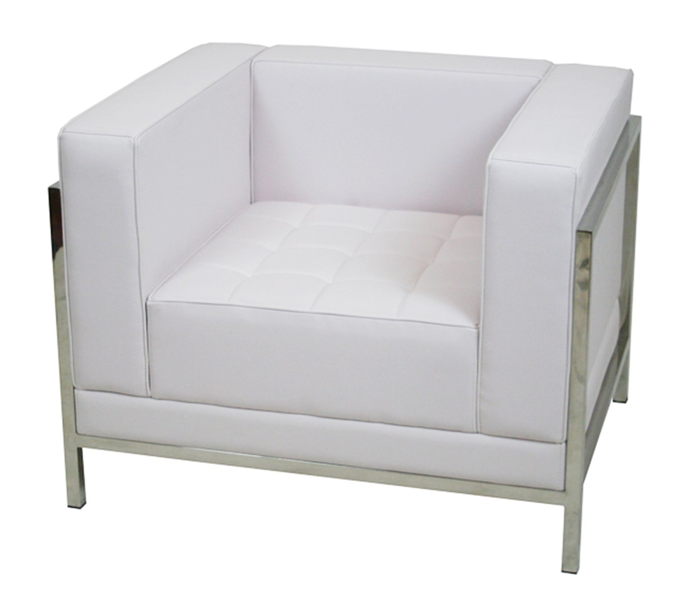 RACMACLG742 35" Maui Arm Chair $454 Modern rental Maui chair in white plush leather and chrome accents.