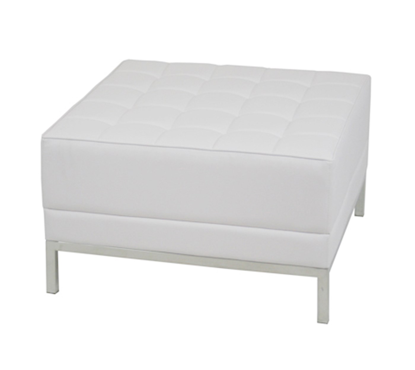 RACMOLG745 28" Maui Ottoman $290 Modern rental Maui ottoman in white plush leather and chrome accents.