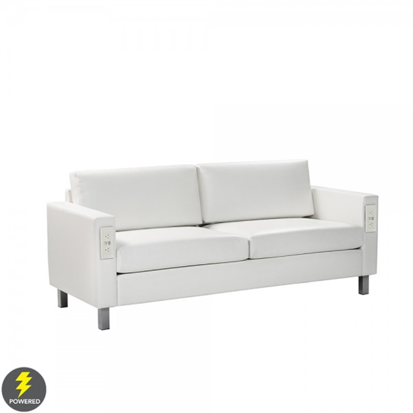 Modern rental bright white Roma Sofa with silver brushed metal accents and connectivity.