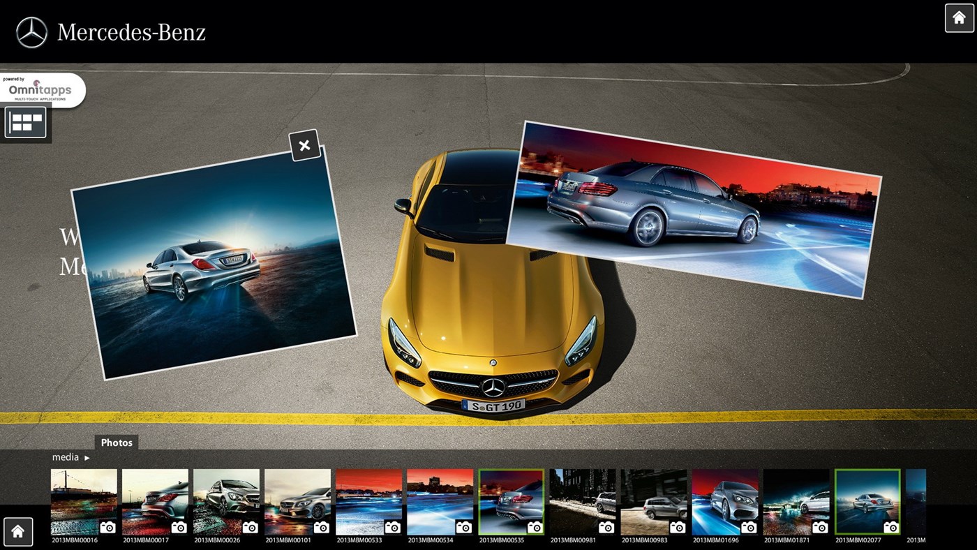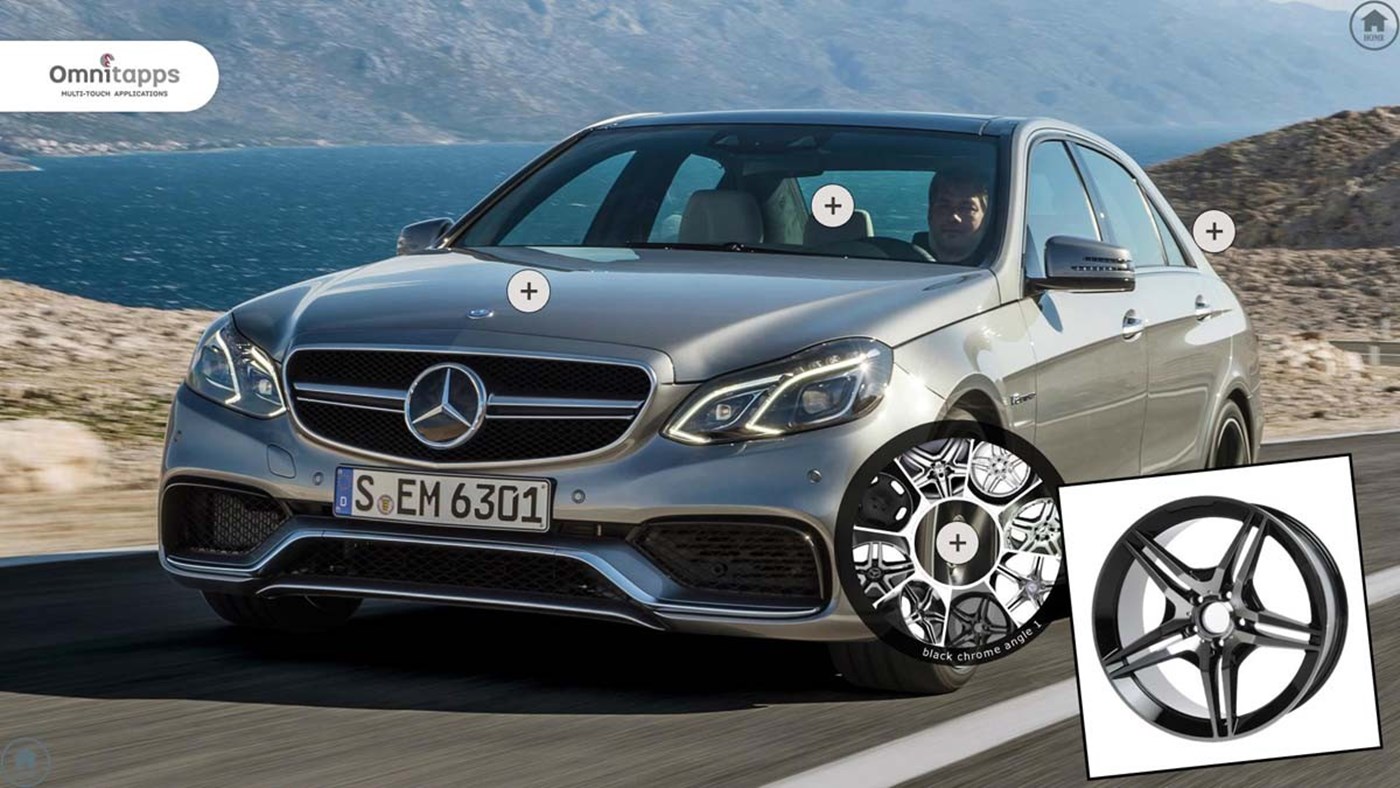 Home screen design options include static photo or movie file background, company logo, scrolling text and active buttons.