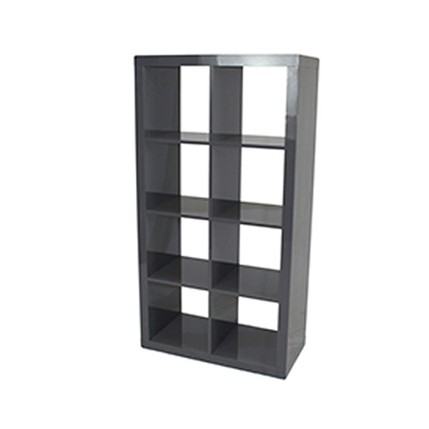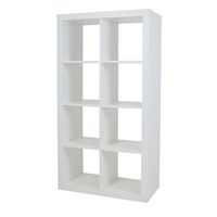 Modern rental Cube shelf with wood finish and multiple compartments.