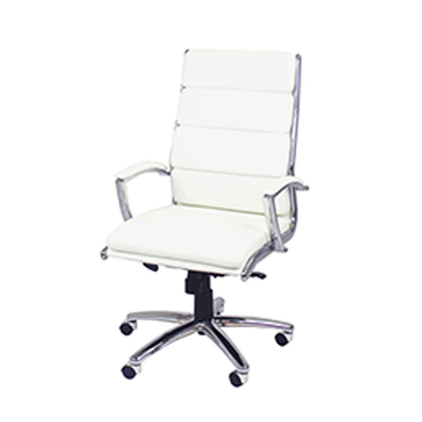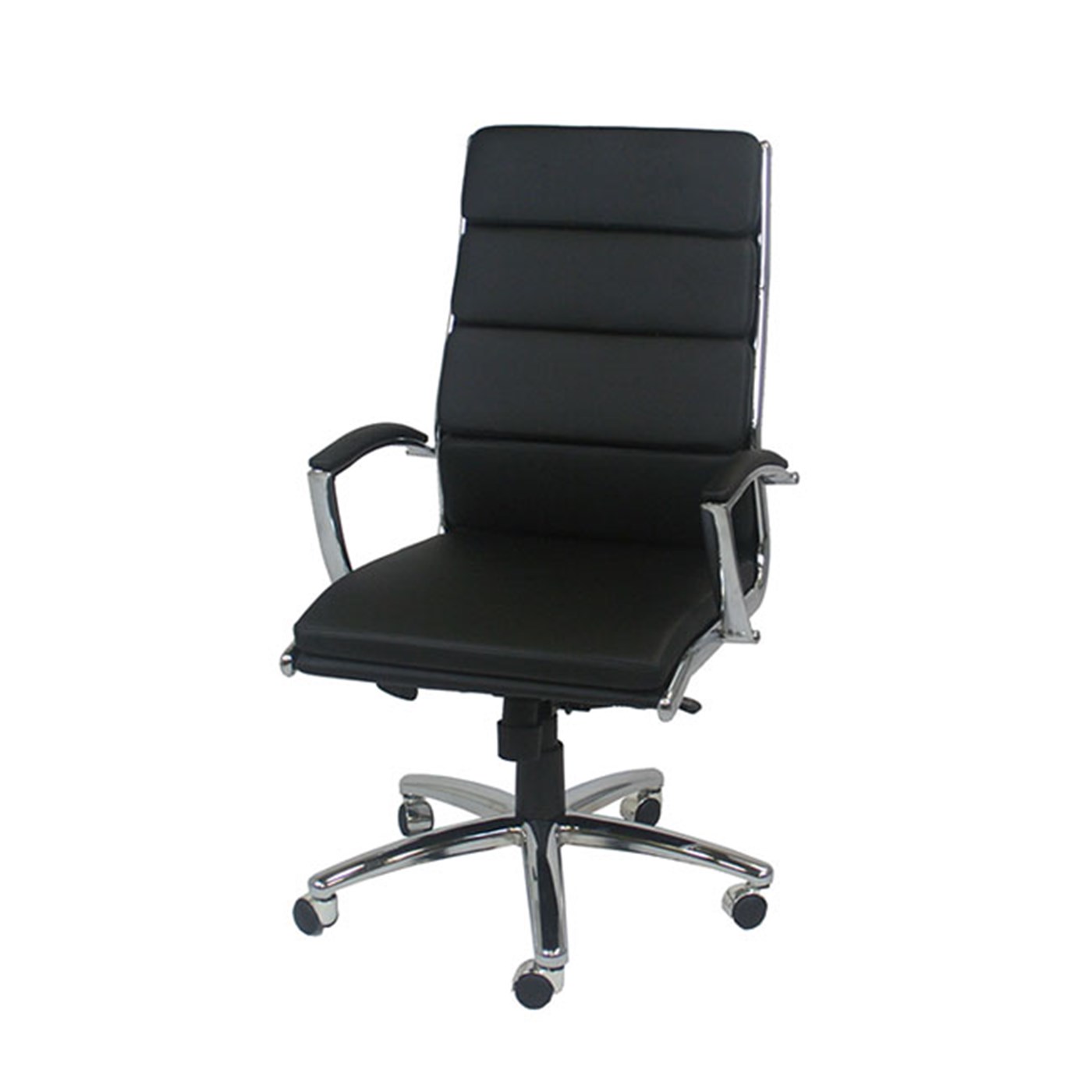 Modern rental High-back executive chair with leather seating, chrome accents and multiple seating adjustments.