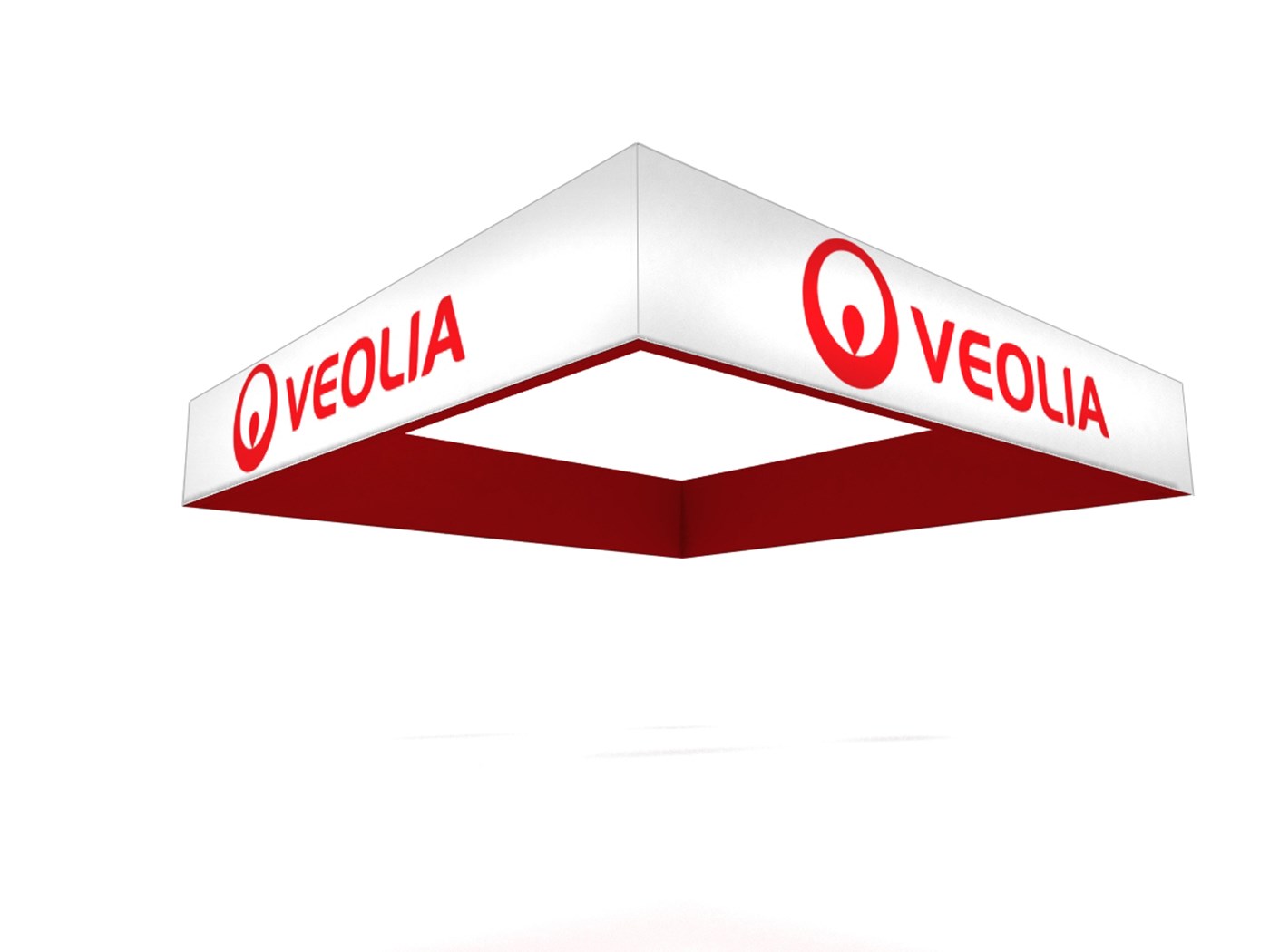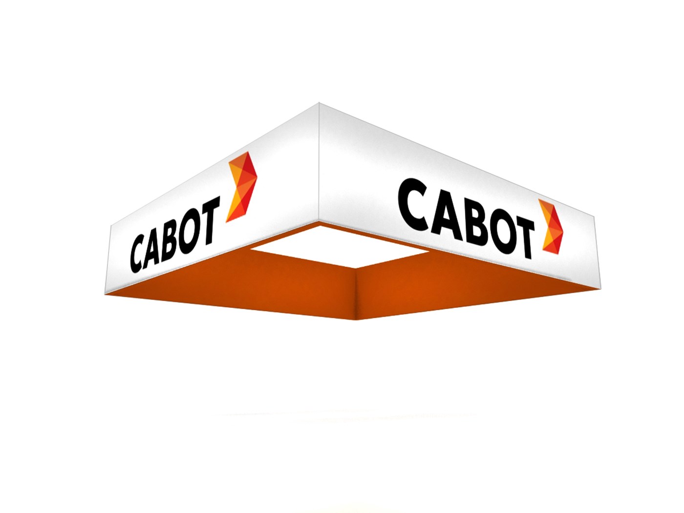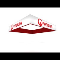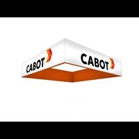 Rental square hanging sign constructed with durable 2" diameter aluminum tubing and push pin assembly. Zipper pillow case tension fabric graphics for easy install. Several diameter dimensions and heights available to compliment booth design. Rolling case and cables included.