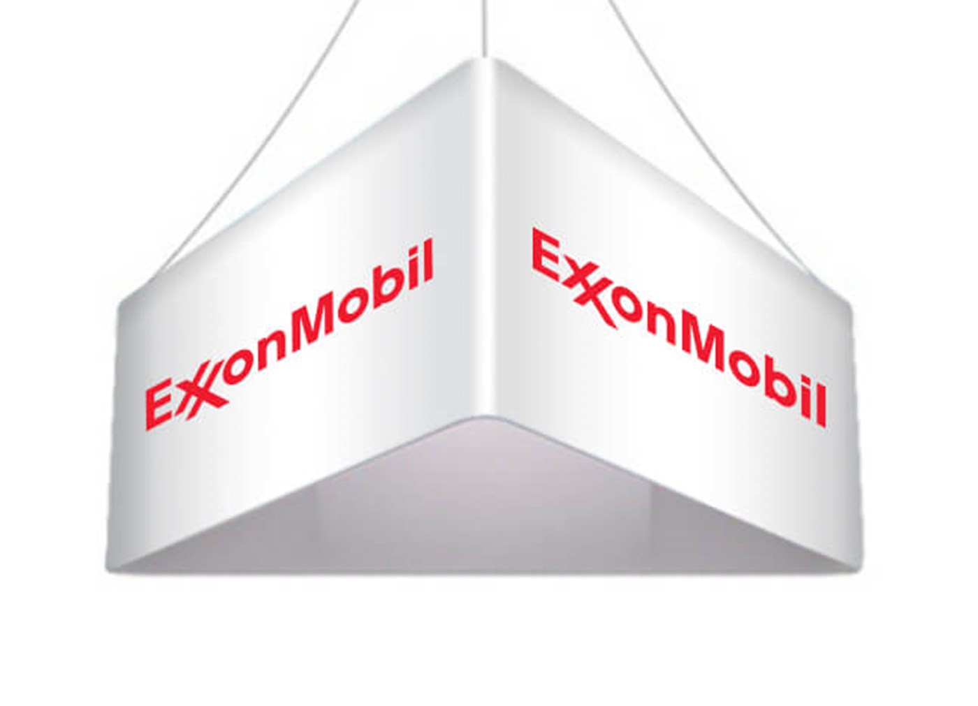 Brand your space from a distance with a triangular rental hanging sign with bold graphics.